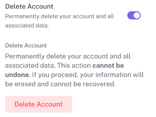 3. Confirm the account deletion by clicking the Delete Account action button.